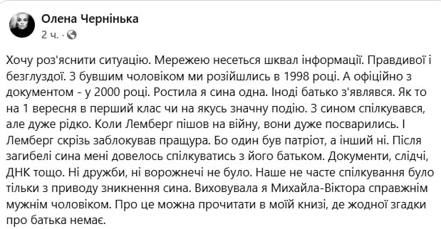 По словам Черненькой, они с мужем развелись в 2000-м, но отец с сыном до войны общался, а после ссоры с отцом из-за ухода в армию сын заблокировал все контакты с ним.