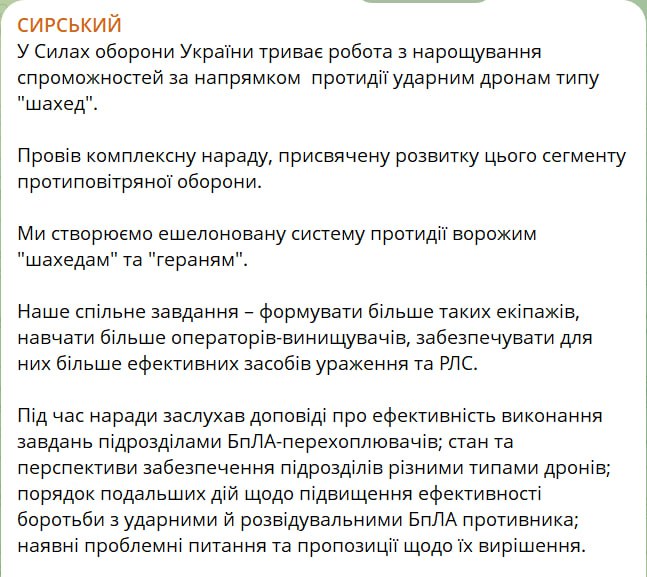 "Поставил задачу по устранению недостатков и усилению работы по направлению дронов-перехватчиков", – написал главком ВСУ.