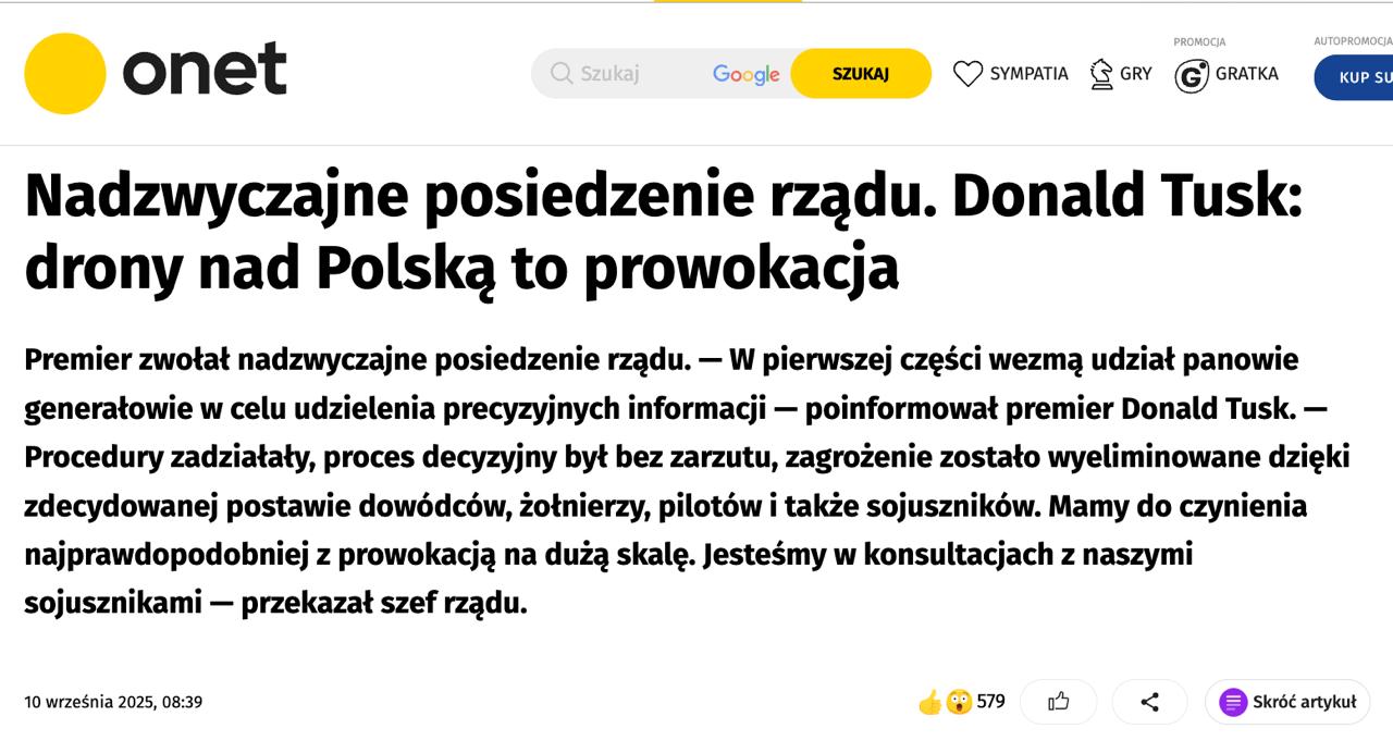 9.34 Премьер Польши Туск официально заявил, что дроны, залетевшие на территорию страны, были российскими.
