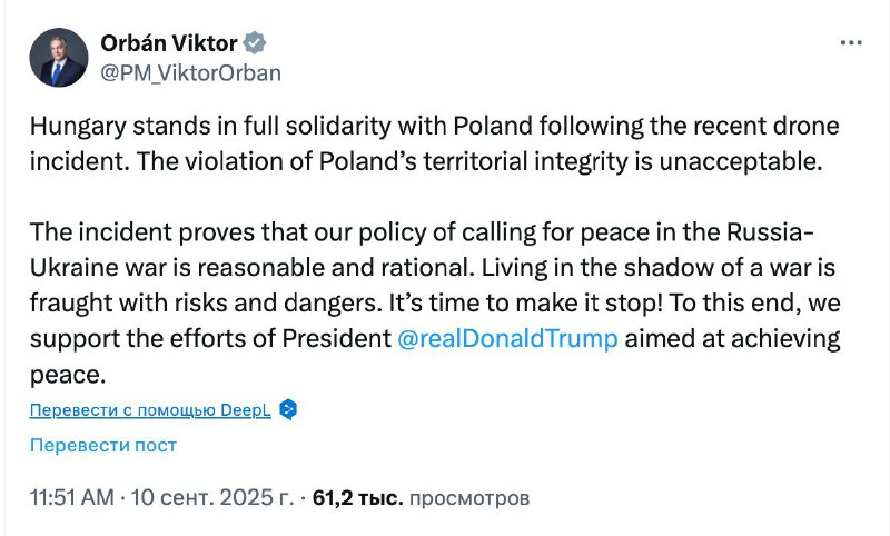 "Венгрия полностью солидарна с Польшей после недавнего инцидента с дронами. Нарушение территориальной целостности Польши неприемлемо. Этот инцидент доказывает, что наша политика призывов к миру в войне между Россией и Украиной является разумной и рациональной. Жизнь в тени войны чревата рисками и опасностями. Пора положить этому конец. С этой целью мы поддерживаем усилия президента Трампа, направленные на достижение мира", - написал премьер Венгрии в Х.