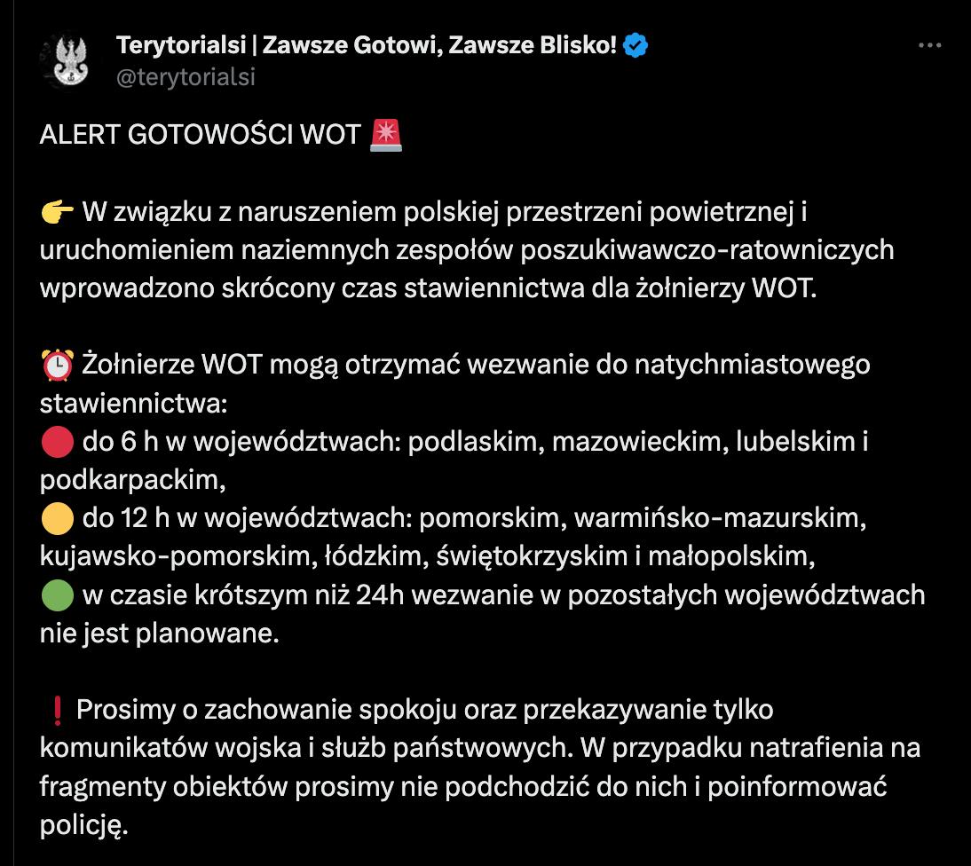"Во время сегодняшней атаки Российской Федерации, наносящей удары по объектам, находящимся на территории Украины, наше воздушное пространство неоднократно нарушалось объектами типа дрон. Ведётся операция, целью которой является идентификация и нейтрализация этих объектов. По приказу Оперативного командующего ВС Польши было применено вооружение, а службы проводят мероприятия по обнаружению сбитых аппаратов.