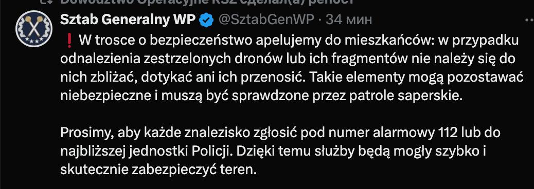 "Во время сегодняшней атаки Российской Федерации, наносящей удары по объектам, находящимся на территории Украины, наше воздушное пространство неоднократно нарушалось объектами типа дрон. Ведётся операция, целью которой является идентификация и нейтрализация этих объектов. По приказу Оперативного командующего ВС Польши было применено вооружение, а службы проводят мероприятия по обнаружению сбитых аппаратов", - говорится в сообщении.