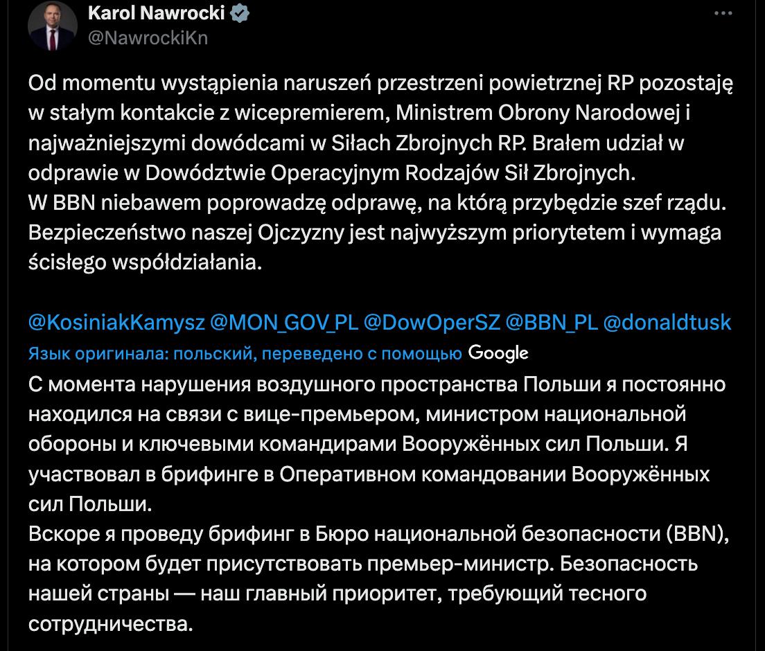 В свою очередь президент Польши Кароль Навроцкий прокомментировал нарушение воздушной границы беспилотниками, но не указал, чьи они были.