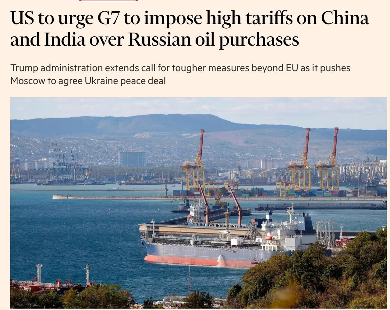"США будут оказывать давление на страны G7, чтобы они ударили по Индии и Китаю резким повышением пошлин за покупку российской нефти в попытке заставить Москву начать мирные переговоры с Украиной, сообщили четыре человека, проинформированные о планах", - сообщает издание.