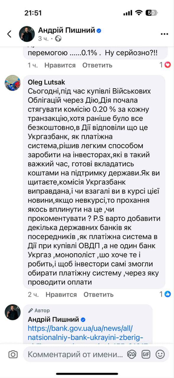 "Что такого случилось, что при покупке ОВГЗ через "Дию" проявились неожиданные 0,2% банковской комиссии? Это бедным и несчастным банкам ликвидности не хватает?" - спросил пользователь Юрий Дереш.