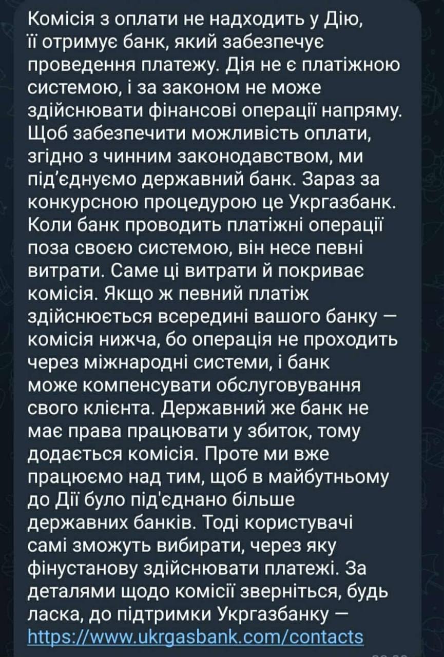 В своем ответе "Дия" пояснила, что эти 0,2% взыскивает не она сама, а обслуживающий банк - государственный "Укргазбанк".