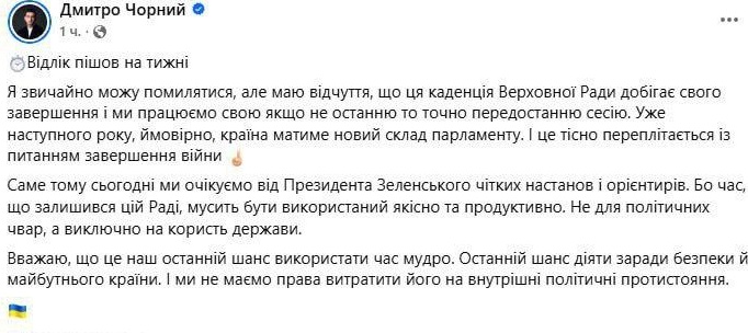 "Отсчет пошел на недели. Я, конечно, могу ошибаться, но чувствую, что эта каденция Верховной Рады подходит к своему завершению, и мы работаем свою если не последнюю, то точно предпоследнюю сессию. Уже в следующем году, вероятно, у страны будет новый состав парламента. И это тесно переплетается с вопросом завершения войны", - написал Черный.