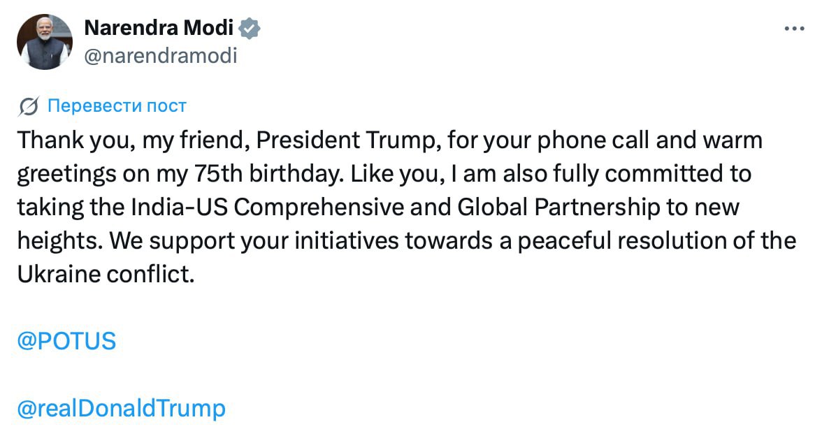 "Только что состоялся замечательный телефонный разговор с моим другом, премьер-министром Нарендрой Моди. Я поздравил его с днём рождения. Он проделывает колоссальную работу. Нарендра: спасибо за вашу поддержку в прекращении войны между Россией и Украиной!" – говорится в сообщении.