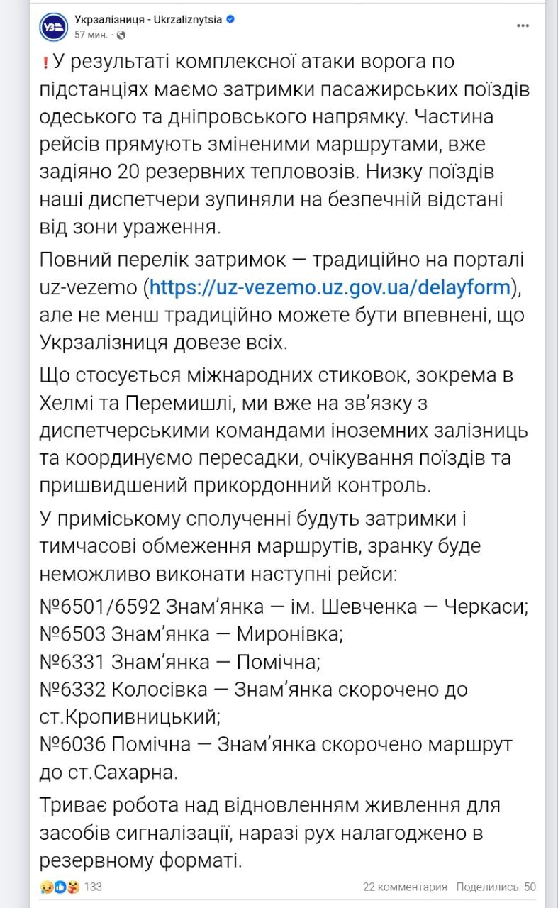 Судя по сообщению, основной удар был в районе станции Знаменка Кировоградской области - отменены или сокращены поезда, которые через неё идут.