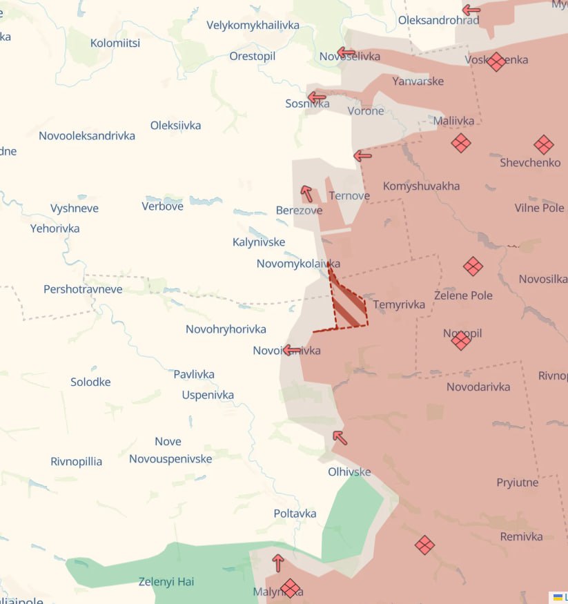 "Противник фактически дожал Новоивановку, промзона ещё удерживается, но сама территория села уже превратилась в красную зону, куда постепенно стягиваются силы противника. Чуть южнее враг занял несколько опорных пунктов, которые раньше фактически пустовали, и теперь они могут использовать их для дальнейшего продвижения. Впереди, в направлении Нововасильевского, ещё остаётся восемь укреплений, а перед Новониколаевкой — несколько опорных пунктов южнее и юго-восточнее по реке Янчур. Дальше практически открытое пространство. Это означает, что населённые пункты Новониколаевка, Нововасиловское, Успеновка, Павловка и Привольное могут стать для противника единым крупным плацдармом. Оттуда уже возможно контролировать участок трассы Покровское — Гуляйполе, что создаёт дополнительную угрозу для наших коммуникаций", - оценивает ситуацию на этом участке украинский боец с позывным "Мучной".
