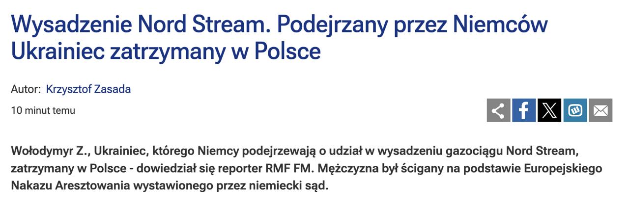 Полиция Польши задержала в Прушкуве украинца Владимира Журавлева, которого правоохранители Германии подозревают в причастности к подрыве ниток газопровода "Северный поток".