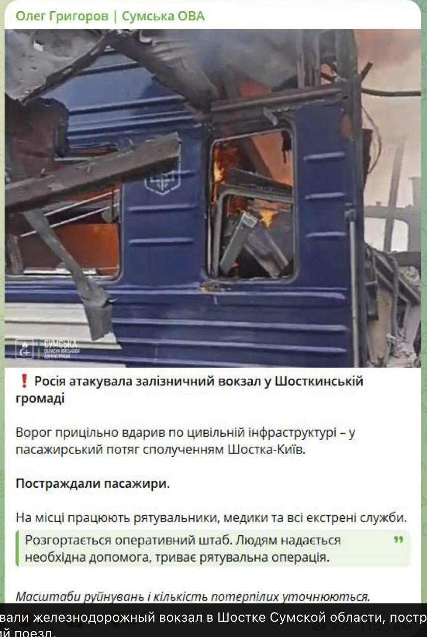 12:15 Дроны атаковали железнодорожный вокзал в Шостке Сумской области, пострадал пассажирский поезд.