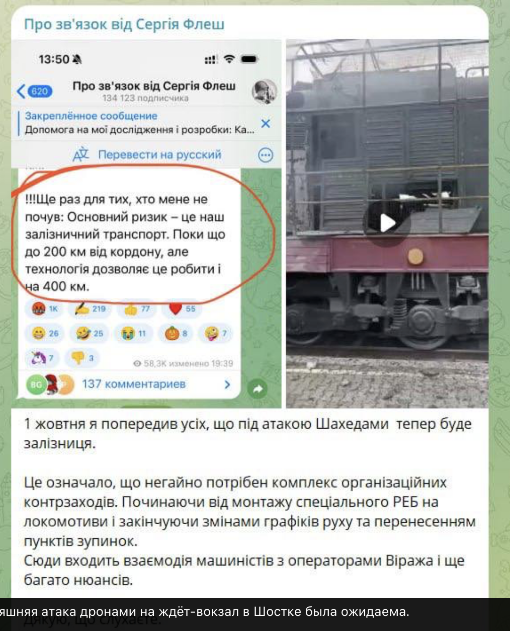 "1 октября я предупредил всех, что под атакой Шахедами теперь будет железная дорога. Это означало, что немедленно требуется комплекс организационных контрмер. Начиная от монтажа специального РЭБ на локомотивы и заканчивая изменениями графиков движения и переносом остановочных пунктов. Сюда входит взаимодействие машинистов с операторами Виража и много нюансов", - пишет "Флеш".