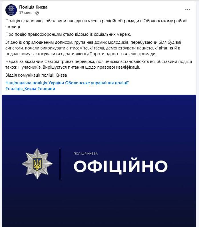 Киевская еврейская община заявляет, что несколько молодых людей подошли к синагоге и начали "демонстративно зиговать". Представитель общины вышел к ним, после чего был залит газом из перцовых баллончиков, а нападавшие скрылись.