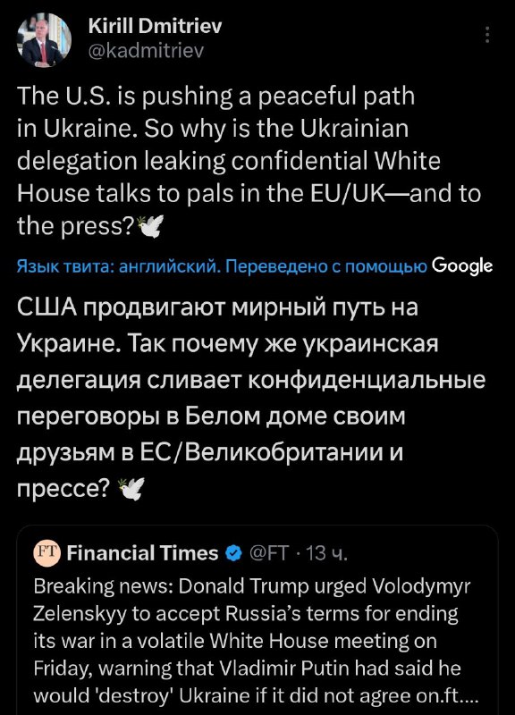 "США продвигают мирный путь в Украине. Так почему же украинская делегация разглашает конфиденциальные переговоры Белого дома своим друзьям в ЕС/Великобритании и прессе?" - написал Дмитриев в Х.