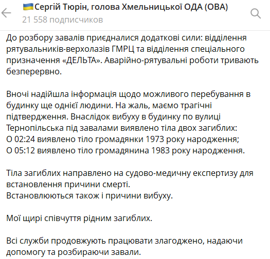 Об этом сообщил в своем телеграм-канале глава Хмельницкой областной военной администрации Сергей Тюрин.