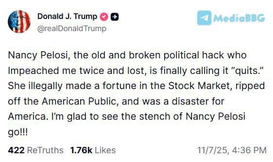 "Уход Нэнси Пелоси - великое событие для Америки. Она была злой, коррумпированной и сосредоточенной только на плохом для нашей страны. Она быстро теряла контроль над своей партией, и он уже не возвращался. Нэнси Пелоси  крайне переоценённый политик", - заявил Трамп.