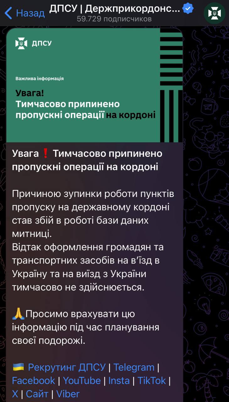 Пропуск граждан и транспортных средств через границу Украины в обоих направлениях остановлен.