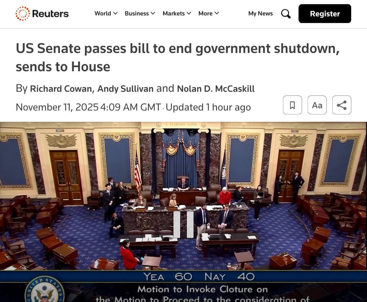 В США сделали первый шаг к преодолению рекордно затянувшегося шатдауна. Сенат одобрил законопроект, направленный на завершение остановки финансирования правительства.