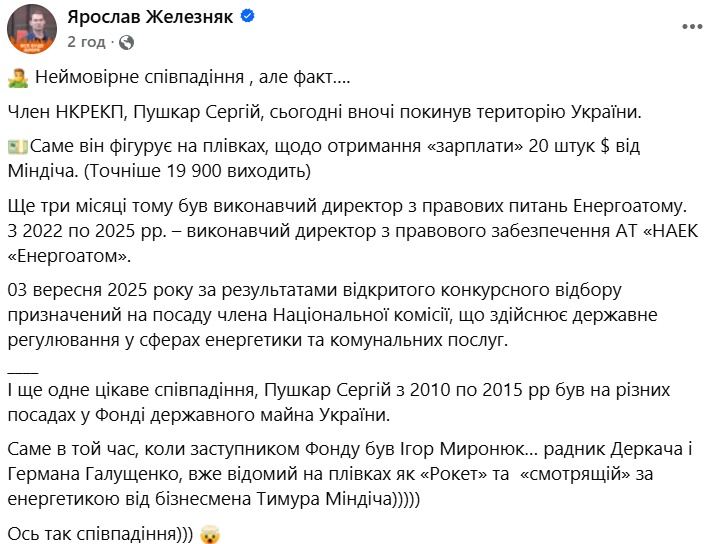 "И ещё одно интересное совпадение: Пушкарь Сергей с 2010 по 2015 годы занимал разные должности в Фонде государственного имущества Украины. Именно в то время, когда заместителем Фонда был Игорь Миронюк… советник Деркача и Германа Галущенко, уже известный по плёнкам как Рокет и смотрящий за энергетикой от бизнесмена Тимура Миндича. Вот так совпадение", - добавил нардеп.