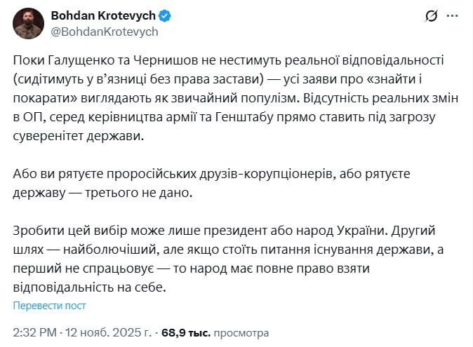"Пока Галущенко и Чернышов не будут нести реальную ответственность (будут сидеть в тюрьме без права залога), все заявления о "найти и наказать" выглядят как обычный популизм", - написал Кротевич в соцсети X.