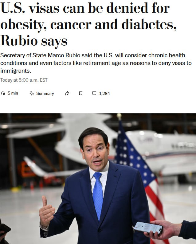 Администрация президента США Дональда Трампа дала указание сотрудникам визового отдела рассматривать диабет, онкологию, неврозы и ожирение, как основания для отказа во въезде.
