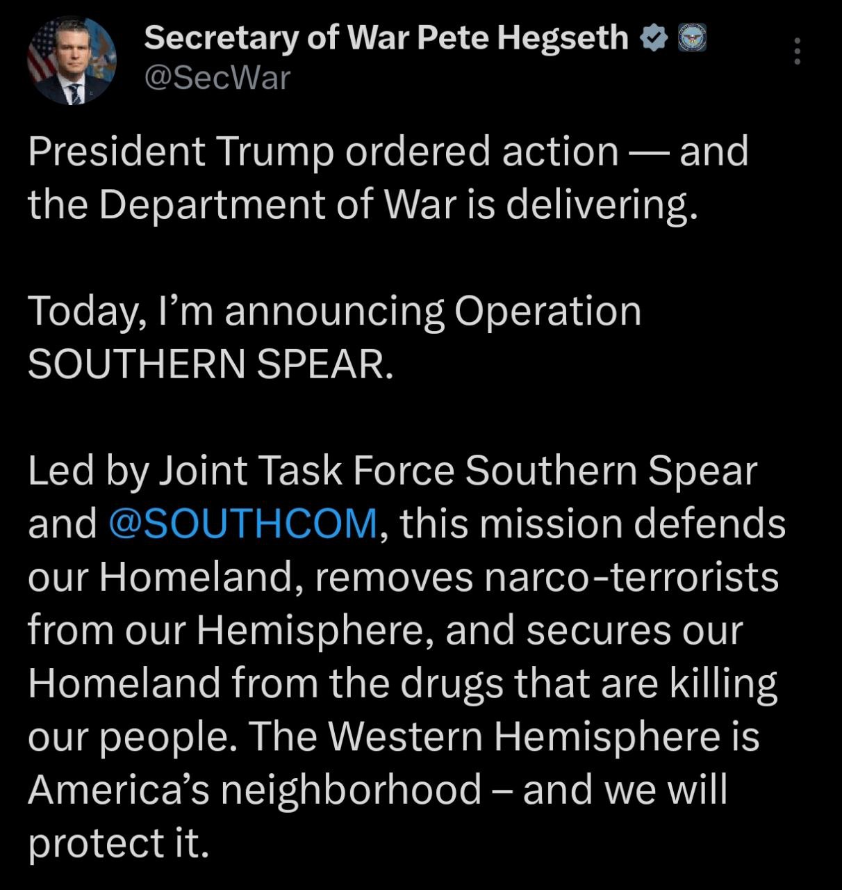 "Эта миссия будет защищать нашу родину, уберёт наркотеррористов из нашего полушария и обеспечит безопасность нашей страны от наркотиков, которые убивают наш народ. Западное полушарие - это территория Америки, и мы будем его защищать", - написал Хегсет.