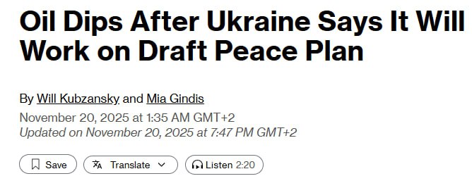 19.51 Зеленскому дали понять, что врученный ему мирный план поддерживает Трамп и что его надо принять, пишет Bloomberg.