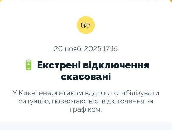 17:33 В Киеве отменены экстренные отключения света. Снова действуют графики плановых отключений.