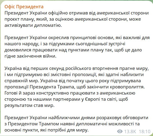 Президент Украины Владимир Зеленский официально получил от американской стороны проект плана, который, по оценке американской стороны, может активизировать дипломатию.