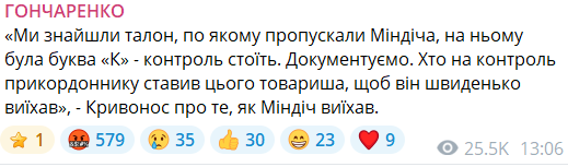 "Мы нашли талон, по которому пропускали Миндича, на нем была буква "К" – контроль стоит. Документируем, кто на контроль пограничнику ставил этого товарища, чтобы он быстренько уехал", - передал слова Кривоноса нардеп.
