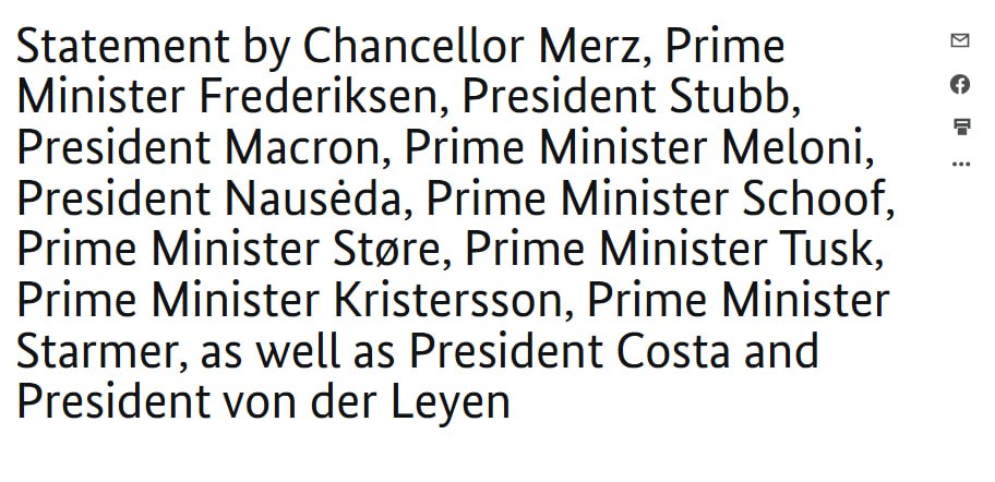 Заявление опубликовано на правительственных сайтах и подписано канцлером ФРГ Фридрихом Мерцем, президентом Финляндии Александером Стуббом, Франции Эмманюэлем Макроном, премьер-министрами Великобритании Киром Стармером, Дании Мэтте Фредериксен, Италии Джорджей Мелони, Швеции Ульфом Кристерссоном и президентами Еврокомиссии Урсулой фон дер Ляйен и Евросовета Антонио Коштой.