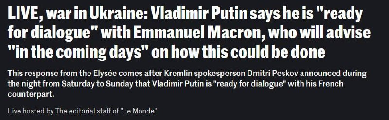 "Французская администрация президента сочла "приветствуемым" предложение президента России Владимира Путина "готовиться" к переговорам со своим коллегой Эммануэлем Макроном, добавив, что она сообщит "в ближайшие дни", как это можно сделать.