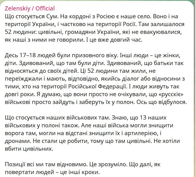 "Где-то 17-18 человек были призывными. Другие люди – это женщины, дети... Эти 52 человека там жили, не переезжали и имеют соответственно какой-то диалог или отношения с теми, кто на территории Российской Федерации. И люди живут столь долгие годы. Я думаю, что они просто не ожидали, что русские военные просто зайдут и заберут их в плен. Что касается наших военных там. Знаю, что 13 наших военных в плену тоже", – написал Зеленский.