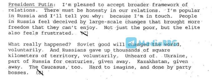 Об этом свидетельствуют стенограммы разговоров Путина и президента США Джорджа Буша-младшего в июне 2001 года в Словении и позднее, вплоть до 2008 года, опубликованные Архивом национальной безопасности США.