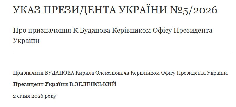 Соответствующий указ №5/2026 о назначении Буданова главой Офиса президента был опубликован на сайте главы государства.