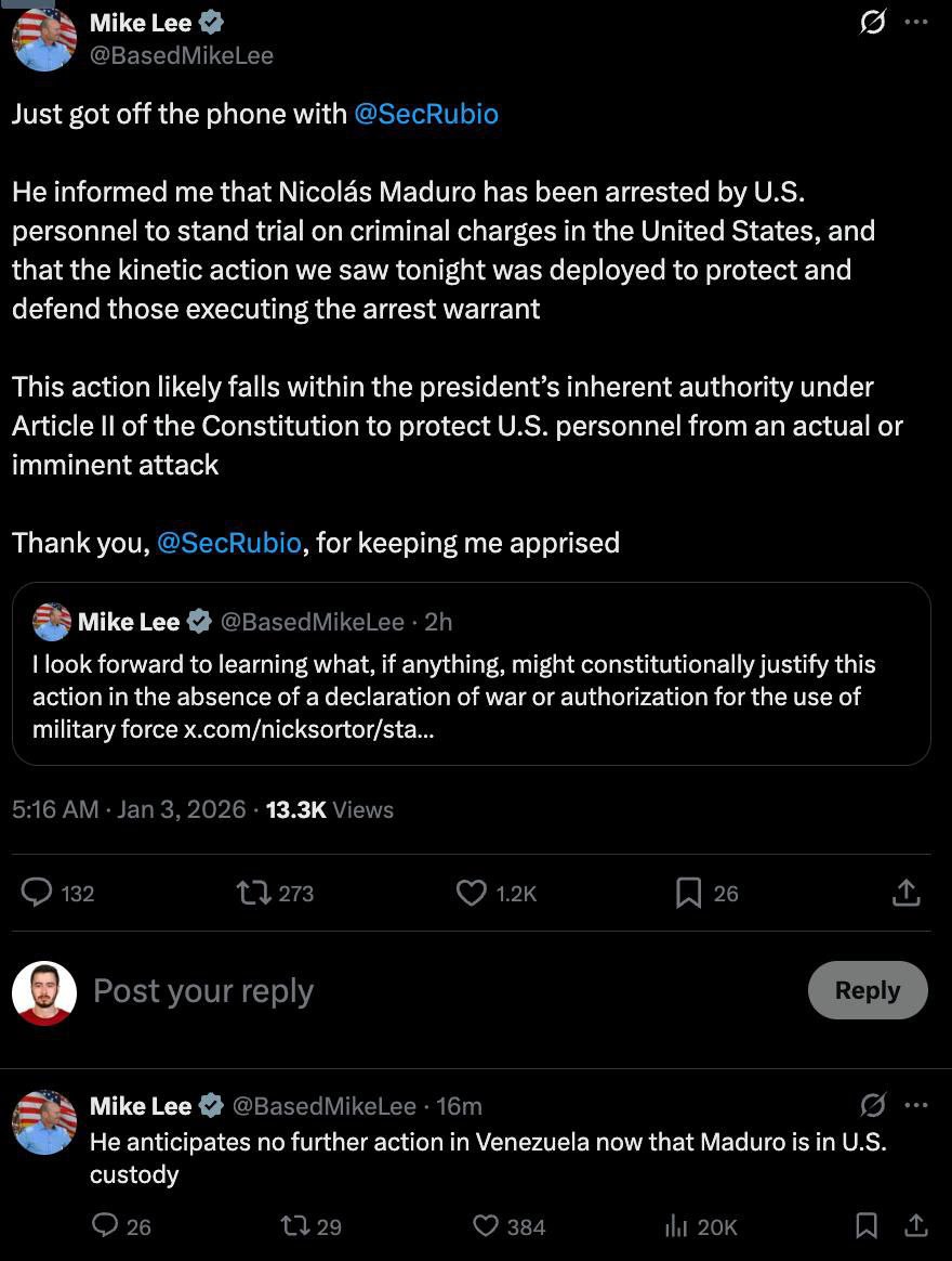 12:37 США не планируют дальнейших действий в Венесуэле после задержания Николаса Мадуро, заявил сенатор Майк Ли.