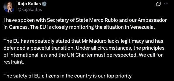 "Я поговорила с государственным секретарем США Марко Рубио и нашим послом в Каракасе. ЕС внимательно следит за ситуацией в Венесуэле. ЕС неоднократно заявлял, что господин Мадуро не обладает легитимностью, и выступал за мирный переходный период. При любых обстоятельствах необходимо соблюдать принципы международного права и Устава ООН. Мы призываем к сдержанности. Безопасность граждан ЕС в стране является нашим главным приоритетом", — написала Каллас.
