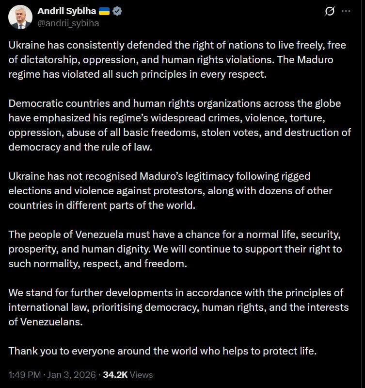 "Украина, как и десятки других стран в разных частях света, не признала легитимность Мадуро после сфальсифицированных выборов и насилия в отношении протестующих. Народ Венесуэлы должен иметь возможность жить нормальной жизнью, в безопасности, процветании и с человеческим достоинством. Мы будем и дальше поддерживать их право на такую нормальную жизнь, уважение и свободу.