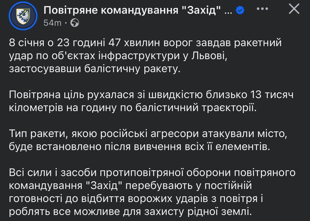 04:42 Воздушное командование "Запад" заявило, что скорость прилетевшей во Львовскую область ракеты составила 13 000 км в час. Тип ракеты устанавливается. Указывается, что она ударила по объекту инфраструктуры во Львове.