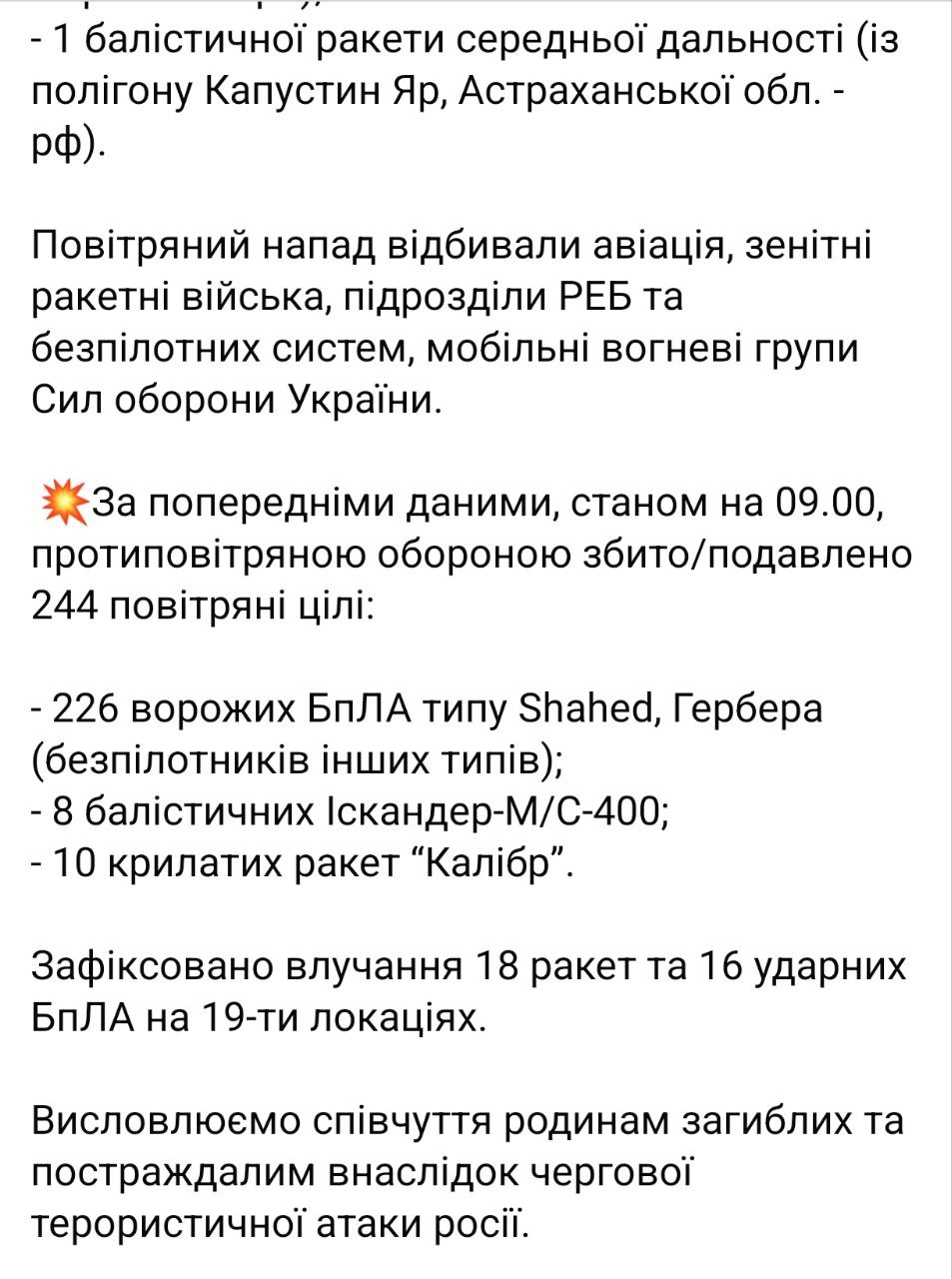 "В общей сложности за эту ночь было 242 дрона, только баллистических ракет и именно против объектов энергетики и гражданской инфраструктуры – 13, одна баллистическая ракета средней дальности "Орешник", а также 22 крылатые ракеты. Атака именно тогда, когда происходит значительное похолодание. Именно против обычной жизни обычных людей", - пишет президент.