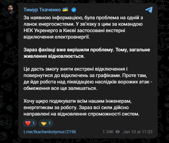 "Была проблема на одной из цепей энергосистемы, проблему решили. Электропитание восстанавливается. Это даст возможность снять экстренные отключения и вернуться к графикам. Поскольку ведется работа по ликвидации последствий атаки, ограничения все еще остаются", - заявил Ткаченко.