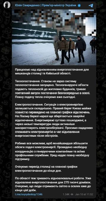 "Теплогенерирующие объекты подают теплоноситель в жилые дома, продолжается поэтапный запуск подачи непосредственно в квартиры. Полную подачу тепла ожидаем уже сегодня. Ситуация с электроэнергией остаётся сложной. Правый берег Киева почти полностью переведён на плановые графики отключений. На Левом берегу пока ещё сохраняются аварийные отключения. Ожидаем переход столицы на плановые графики электроснабжения к концу дня", - пишет Свириденко в своем Telegram-канале.