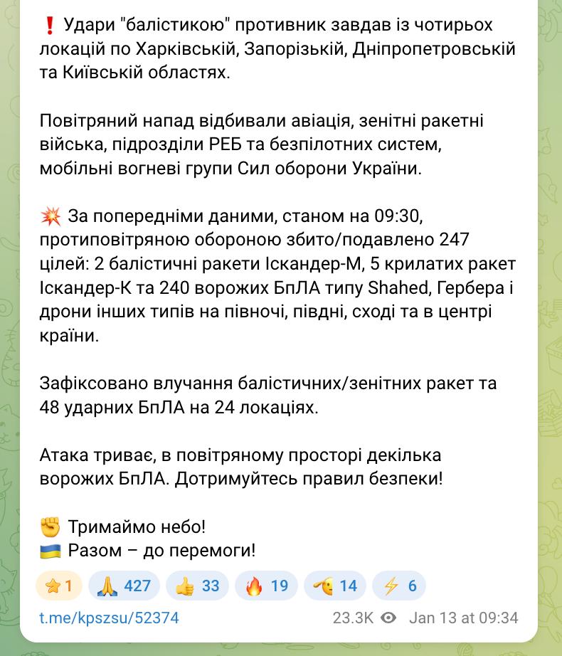 Зафиксировано попадание баллистических/зенитных ракет и 48 ударных БПЛА на 24 локациях.