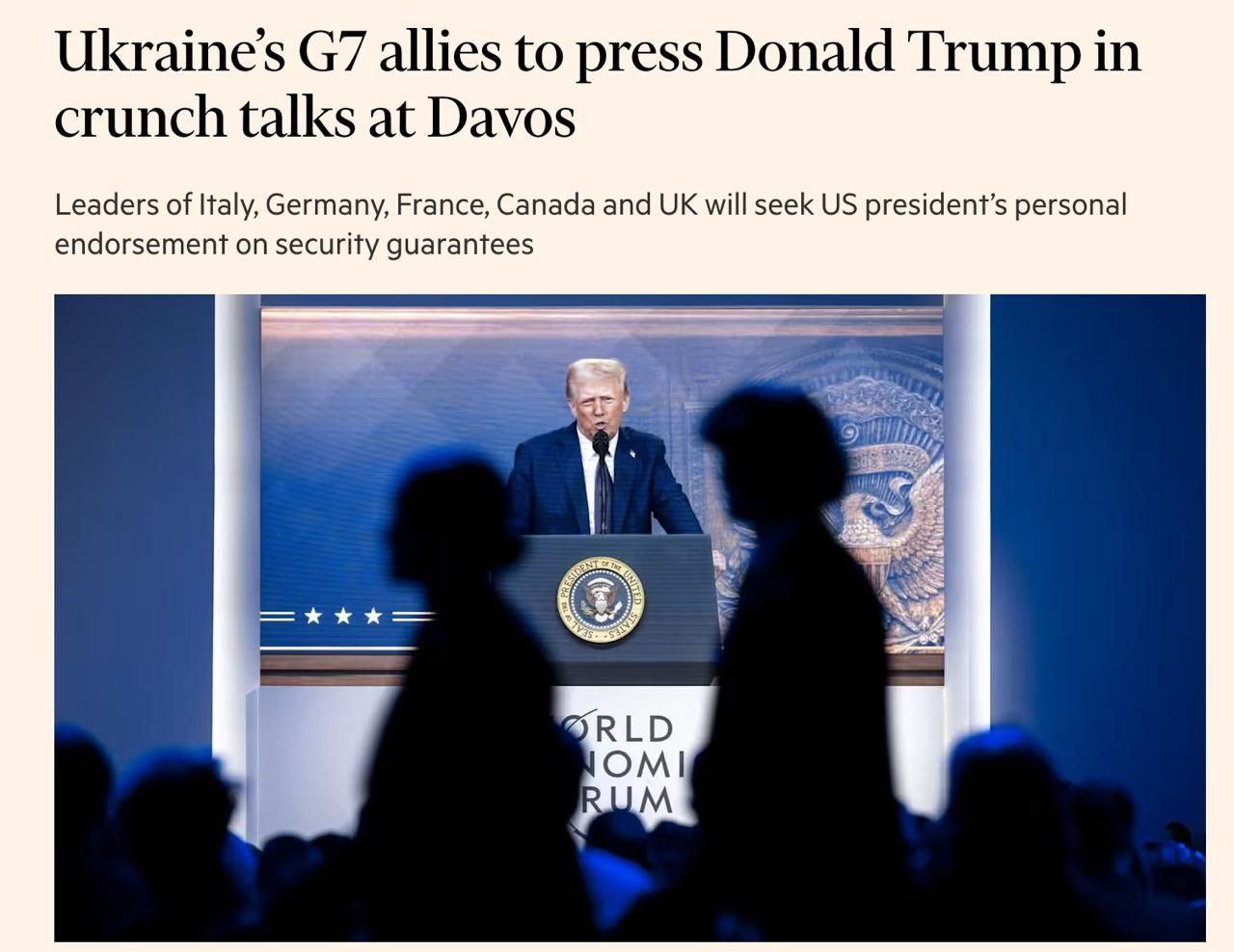 Издание пишет, что президент Украины Владимир Зеленский и глава Белого дома могут встретиться на следующей неделе во время форума в Давосе. Во встрече планируют принять участие лидеры Италии, Германии, Франции, Канады и Великобритании, а также председатель Еврокомиссии Урсула фон дер Ляйен. Главная цель встречи - заручиться поддержкой США насчет гарантий безопасности Украине, предложенных в Париже.