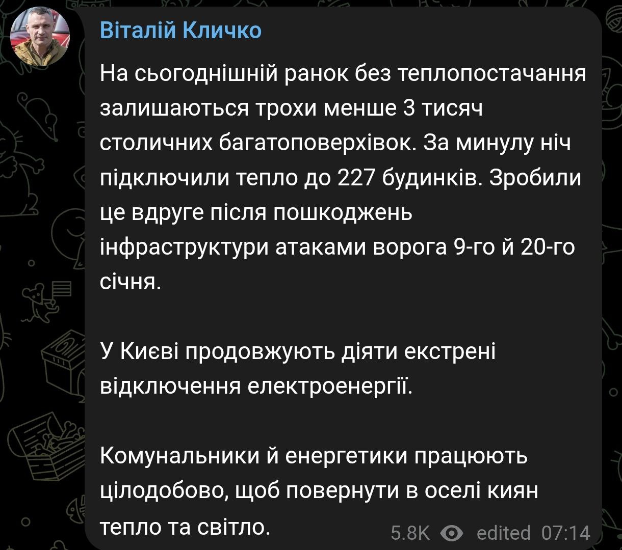 08:21 В Киеве без отопления остается около трех тысяч многоквартирных домов, сообщил Кличко. По его словам, за прошедшую ночь подачу отопления восстановили в 270 домах.