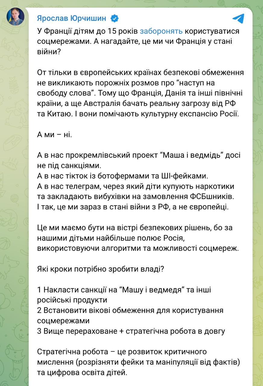 "А напомните, это мы или Франция воюем? Вот только в европейских странах ограничения безопасности не вызывают пустых разговоров о "наступлении на свободу слова". Потому что Франция, Дания и другие северные страны и Австралия видят реальную угрозу от РФ и Китая. И они подмечают культурную экспансию России. А мы – нет. А у нас прокремлевский проект "Маша и Медведь" до сих пор не под санкциями. А у нас ТикТок с ботофермами и ИИ-фейками. А у нас Телеграм, через который дети покупают наркотики и закладывают взрывчатки по заказу ФСБ.