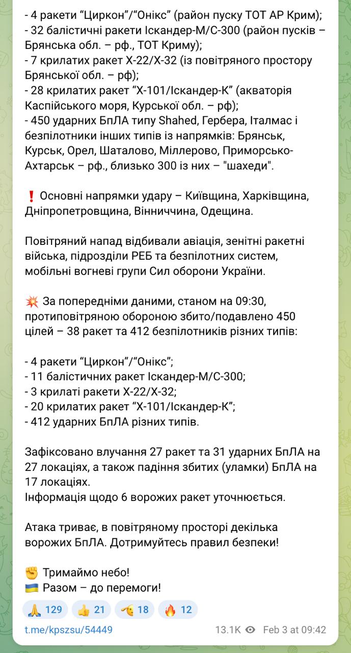 9.30 РФ этой ночью выпустила по энергетике Украины более 70 ракет, в том числе большое количество баллистических, и 450 БпЛА, сообщает Зеленский.