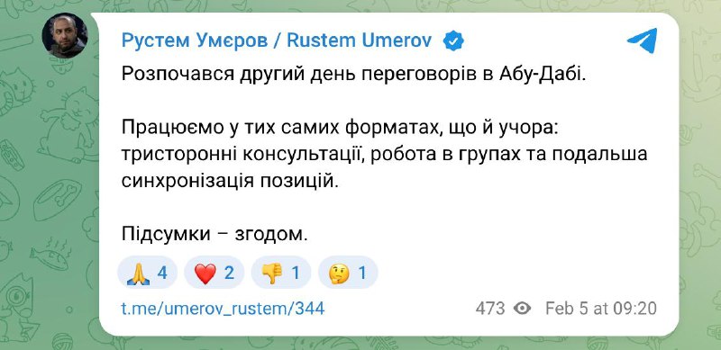09:24 В Абу-Даби начался второй день переговоров Украины, США и РФ, сообщает глава украинской делегации Умеров.