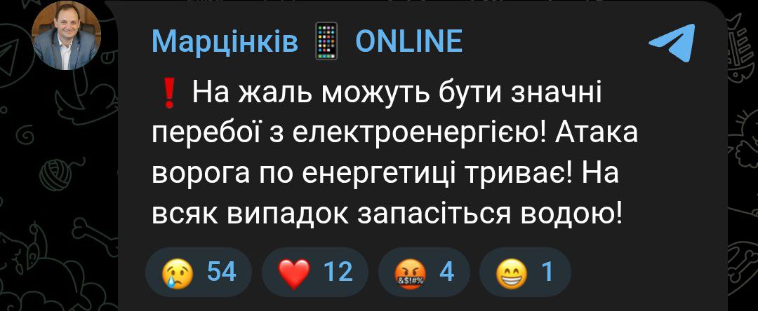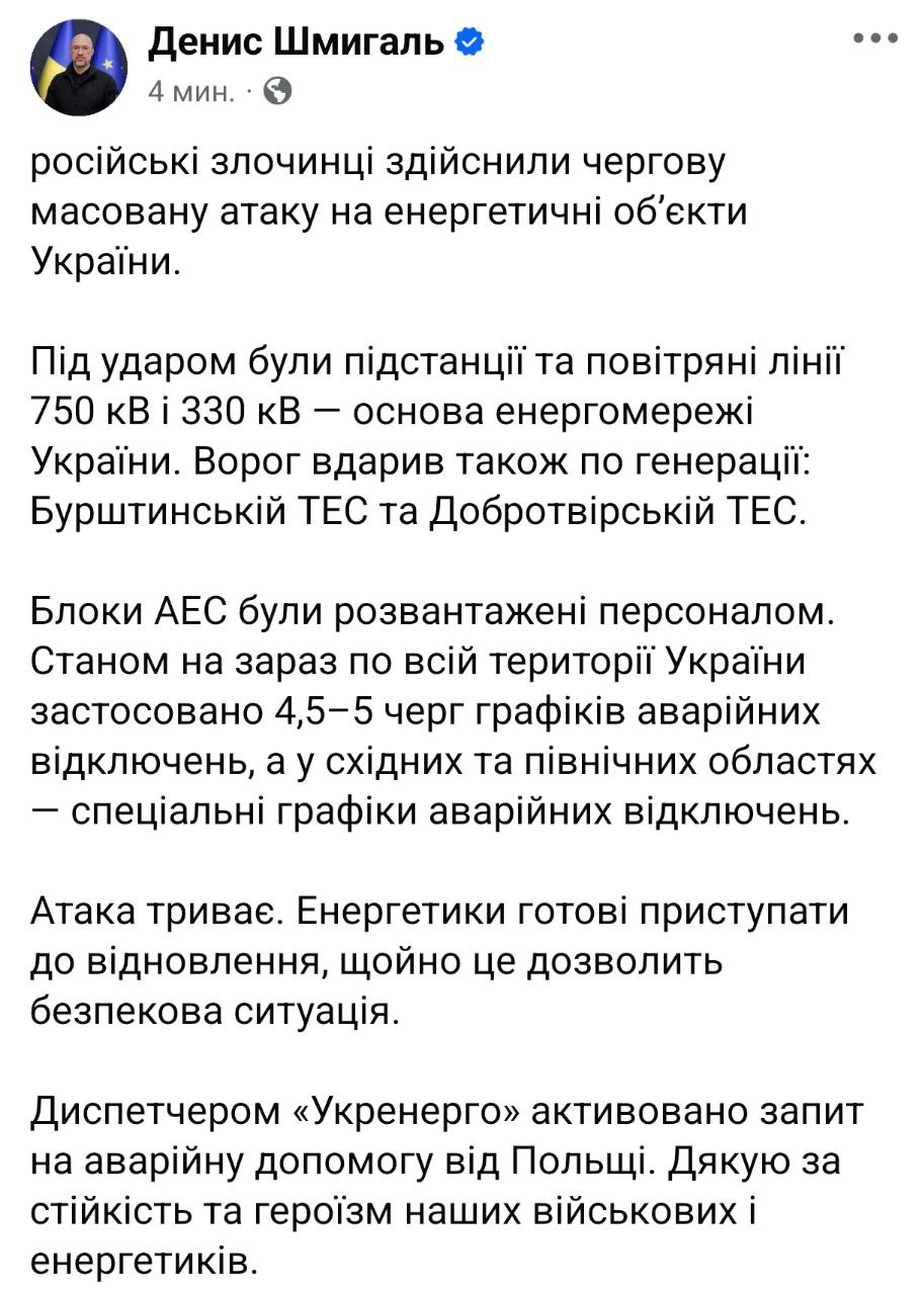 Министр энергетики Денис Шмыгаль заявил, что целью сегодняшнего удара стали подстанции и воздушные линии электропередачи напряжением 750 и 330 кВ — основа энергосистемы Украины.
